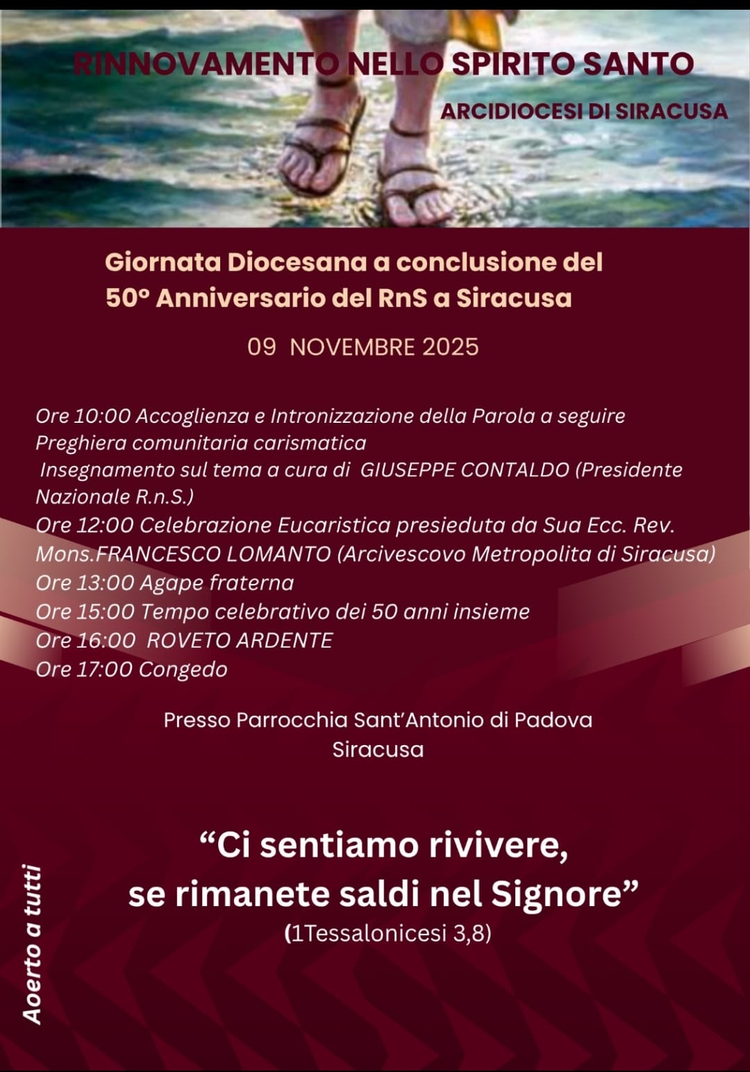 Giornata diocesana a conclusione del 50° anniversario del Rinnovamento nello Spirito Santo nella Arcidiocesi di Siracusa in programma domenica 9 novembre 2025 presso la parrocchia SantAntonio di Padova, a Siracusa su Ci sentiamo rivivere, se rimanete saldi nel Signore (1 Tessalonicesi 3,8)