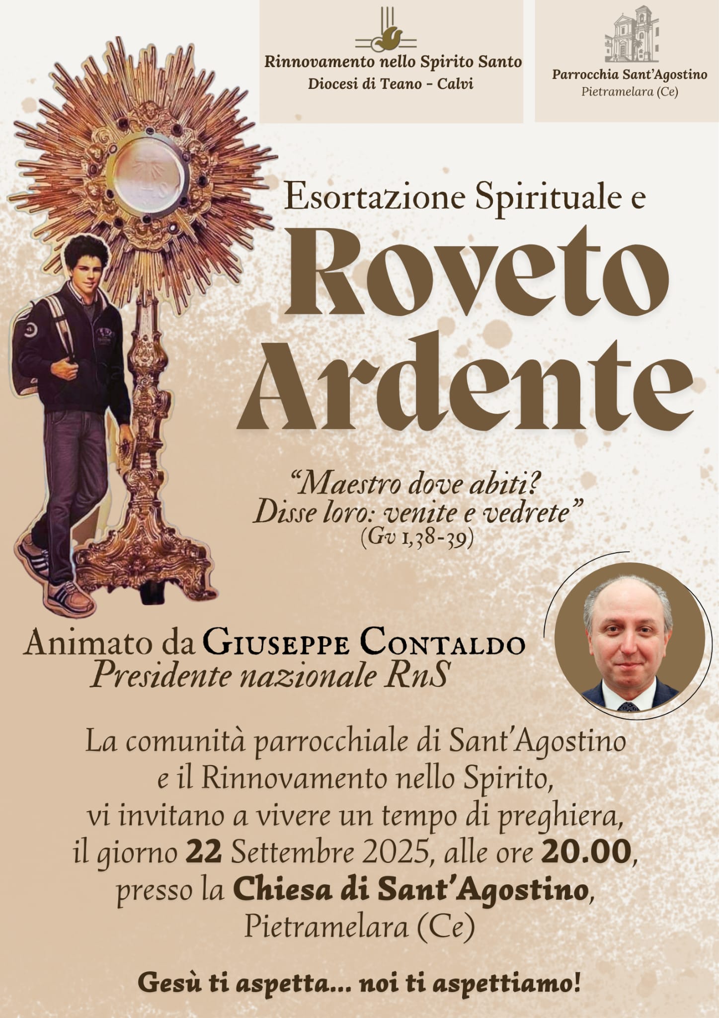 Sarà Giuseppe Contaldo, Presidente nazionale del RnS, ad animare l’Esortazione spirituale e il Roveto ardente presso la chiesa di Sant’Agostino di Pietramelara (CE) lunedì 22 settembre 2025, alle ore 20.00, su “Maestro dove abiti? Disse loro: venite e vedrete” (Gv 1, 38-39)